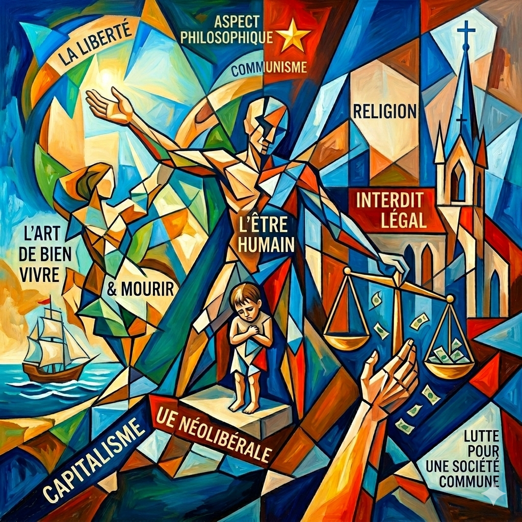 Mais même cela ne serait pas suffisant dans une société restée fondamentalement capitaliste-impérialiste, donc tournée vers le profit de quelques-uns et non vers l’égal respect de chacun. Si bien que la question-clé que ne posent jamais les médias dominants n’est pas exclusivement philosophique: elle est aussi et d’abord sociale, économique et politique. Si bien que l’aspiration à bien vivre et à mourir le moins mal possible est indissociable de la lutte pour une société communiste permettant à chacun de vivre pleinement, pour le meilleur et pour le “moins pire”, notre humaine, mortelle et commune condition.